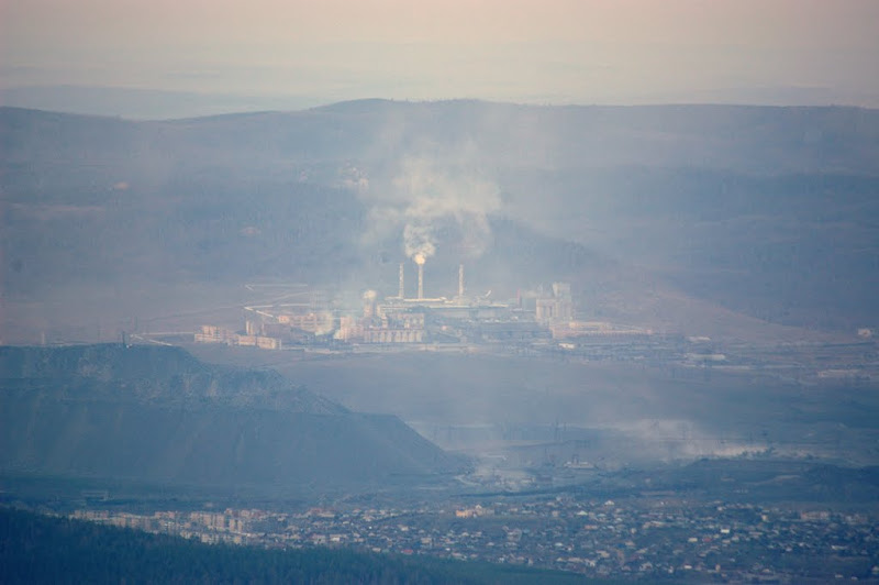 По другую сторону хребта виднеются трубы Саткинского завода и сам город Сатка.
